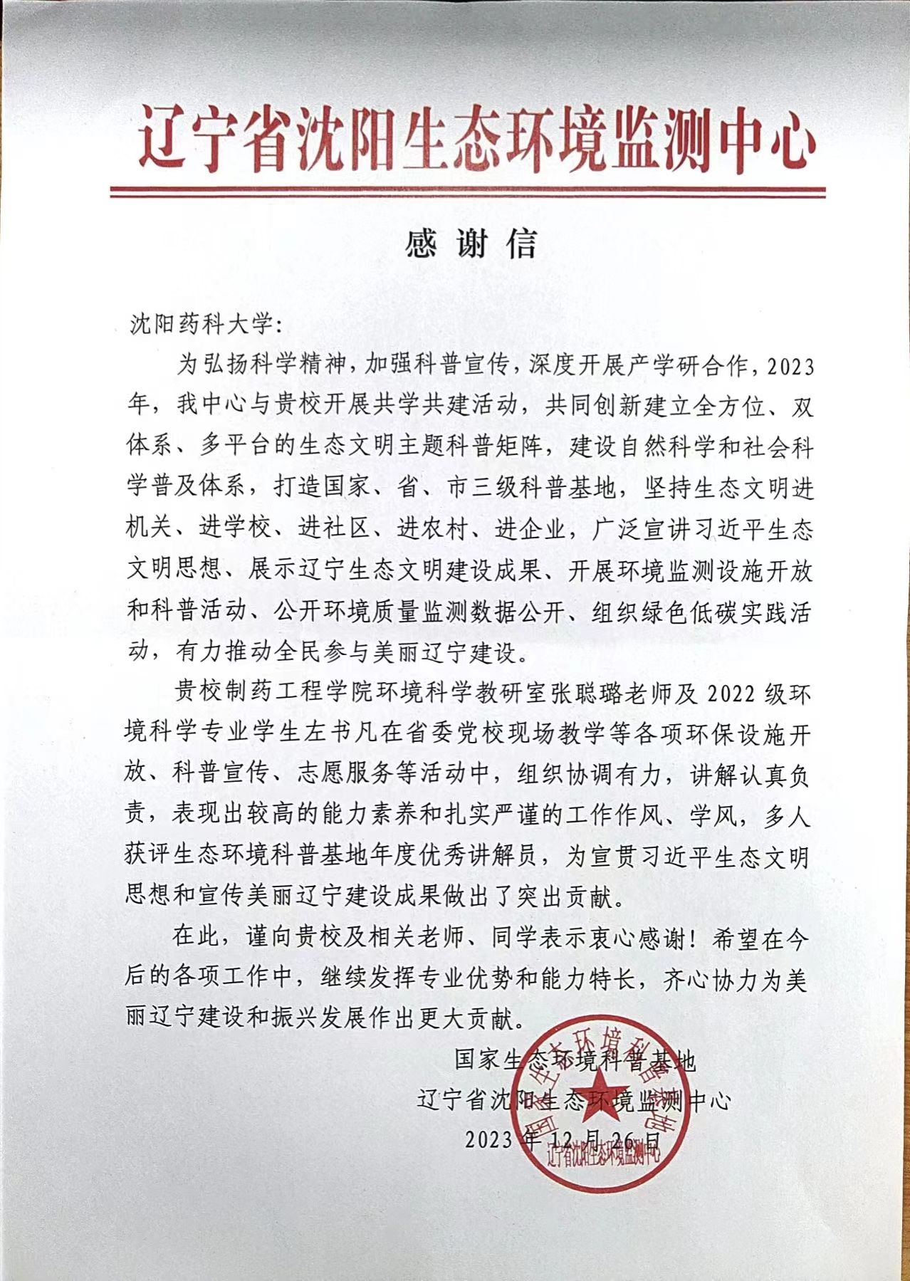近日,BG大游平台收到一封来自辽宁省沈阳生态环境监测中心的感谢信。信中对公司环境科学教研室张聪璐老师及2021级环境科学专业员工左书凡,在省委党校现场教学等各项环保设施开放、科普宣传、志愿服务等活动中的能力素养、工作作风和学风给予高度肯定和赞扬,对公司志愿者表示了由衷的感谢和诚挚的敬意。