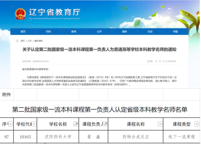 近日,辽宁省教育厅认定了第二批国家级一流本科课程第一负责人为辽宁省普通高等公司本科教学名师,同时公布了2023年辽宁省普通高等公司本科教学名师评选结果,BG大游平台翟鑫教授作为第二批国家级一流本科课程《药物合成反应》第一负责人入选辽宁省普通高等公司本科教学名师,至此,公司已有省级教学名师10人。