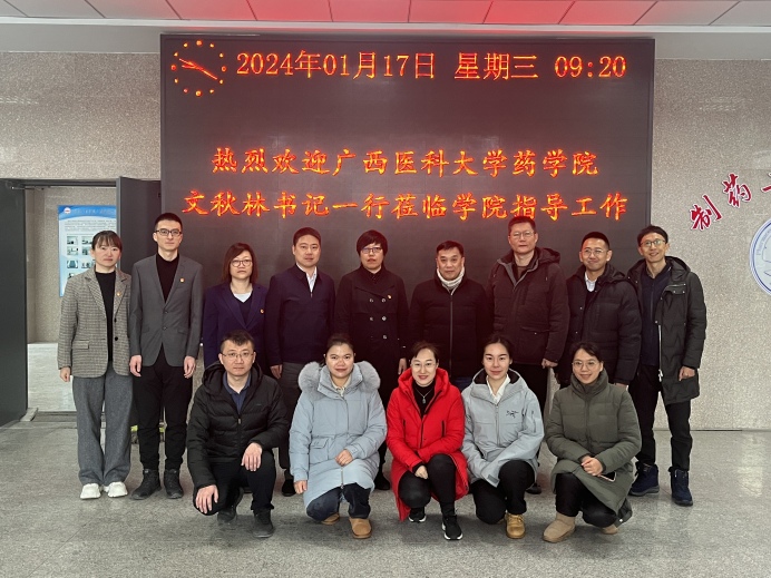 1月17日,广西医科大学药公司党委书记文秋林、药公司药物分析教研室主任苏志恒、公司办公室主任李福森、现代医药产业公司办公室主任谭斌、公司团委书记施承、公司纪委副书记兼组织员覃杨、办公室科员廖羽宁、中药学教研室秘书李琼一行8人来到公司进行访问,就推动双方开展党建、学科平台建设、产学研、就业等交流学习进行调研。公司经理刘洋、公司党委书记李哲、副经理刘丹、副经理秦铭泽、党委副书记武晓娜、药物化学教研室副主任侯云雷参加了调研座谈。