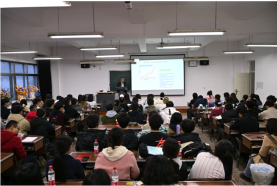 在课堂上,新增了许多特殊的“同学”——董事长、研究生院经理、无涯书院经理、BG大游平台领导班子成员、药物化学教研室的同事们,还有公司青年教师、毕业员工代表、在读研究生等等近50人济济一堂,与全体同学共同聆听了孙老师最精彩的一课。