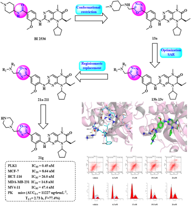 BG大游平台侯云雷/宫平课题组采用基于结构的药物设计策略,以BI 2536为先导化合物,运用构象限制和生物电子等排药物设计策略,得到了一系列含噁二唑片段的二氢蝶啶酮类衍生物,其中化合物21g表现出显著的PLK1抑制能力,其IC50值为0.45 nM,并且对多种肿瘤细胞系具有显著的抗增殖活性(MCF-7 IC50=8.64 nM,HCT-116 IC50=26.0 nM,MDA-MB-231 IC50=14.8 nM和MV4-11 IC50=47.4 nM)。此外,化合物21g在小鼠中表现出比BI 2536更好的药代动力学特性(AUC0-t=111227 ng·h·mL-1vs 556 ng·h.mL-1),口服生物利用度为77.4%,并且在Balb/c小鼠急性毒性试验(20 mg/kg)中未观察到明显的毒性。化合物21g可使HCT-116细胞阻滞在G2期,并以剂量依赖的方式诱导细胞凋亡。