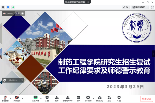 公司党委副书记刘阳为全体参加研究生复试工作的教职工做研究生招生复试工作纪律要求及师德警示教育。刘阳为参会老师介绍了复试纪律要求,她指出,在研究生复试工作中,全体老师要切实提高政治站位,切实增强纪律和规矩意识,共同营造风清气正的考试氛围;要切实认真干净履行职责,确保研究生招生复试各个环节安全有序;要切实加强各环节监督检查,严肃执纪问责。刘阳介绍了四个违反师德师风典型案例,引导公司教职工提高规则意识、底线意识,坚持立德树人,坚守为党育人、为国育才的初心和使命,努力为公司、公司发展贡献力量。