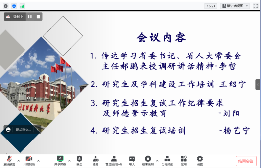 公司研究生辅导员杨艺宁为全体导师作2023年硕士研究生复试培训,她结合《BG大游官方网站2023年硕士研究生复试录取办法》,从考核方式、复试内容、调剂要求、录取办法等方面为导师们进行介绍。