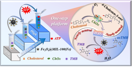 课题组利用微波辅助原位合成法制备了具有优异的模拟过氧化物酶活性的Fe3O4@MIL-100(Fe)。通过优化合成条件,考察了该纳米酶在近中性条件下的模拟过氧化物酶活性和ATP对模拟酶活性的辅助增强作用。同时,展开了催化条件优化、酶促反应动力学考察以及催化机理探讨等一系列实验,并对ATP的辅助增强机制进行了深入研究。最终,基于ATP激发Fe3O4@MIL-100(Fe)增强的模拟过氧化物酶活性建立了胆固醇的一步比色传感平台。该平台可在20 min完成胆固醇的检测,操作简便,准确度高。这一工作为胆固醇的检测和相关疾病的预防与诊疗提供了有力的技术支撑。