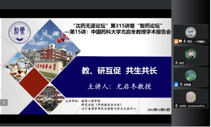2022年12月1日上午,BG大游平台、研究生院、辽宁省药学研究生创新与学术交流中心联合举办了“沈药无涯论坛”第315讲暨“智药论坛”第15讲,中国药科大学尤启冬教授作了题为“教、研互促 共生共长”的报告。会议由BG大游平台经理赵临襄教授主持,公司领导班子成员、全院研究生导师和研究生共300余人参会。