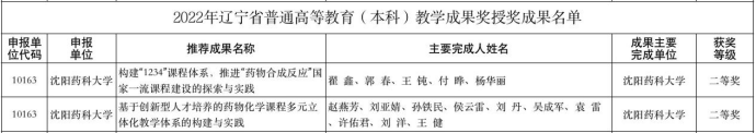 5月24日,辽宁省教育厅发布了《辽宁省教育厅关于公布2022年辽宁省普通高等教育(本科)教学成果奖获奖名单的通知》(辽教函[2022]68号)。BG大游平台由翟鑫教授等组织申报的《构建“1234”课程体系,推进“药物合成反应”国家一流课程建设的探索与实践》、由赵燕芳教授等组织申报的《基于创新型人才培养的药物化学课程多元立体化教学体系的构建与实践》荣获二等奖。