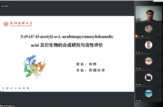 随后,仲烨做了题为“3-O-(4′-O-acetyl)-α-L-arabinopyranosyloleanolic acid及衍生物的合成与活性评价”报告,结合自己的经验与实践探索,详细介绍了天然产物的合成以及应用,并分享了自己的科研心得体会。