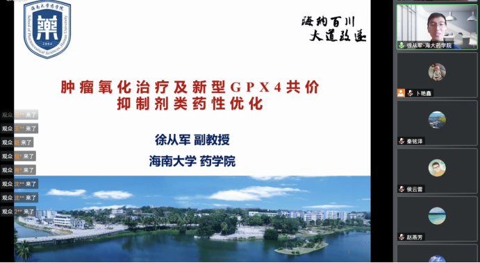 报告结束后,与会师生就GPX4抑制剂涉及到的核心研发问题与徐从军进行了深入讨论和交流,报告受到了一致好评。最后,刘丹对本次论坛进行了总结。疫情期间,克服实际困难,切实做到“防疫不停研、防疫强科研”。本次交流拓宽了广大师生的科研视野和知识领域,对加强团队建设和提升科研能力具有重要意义。