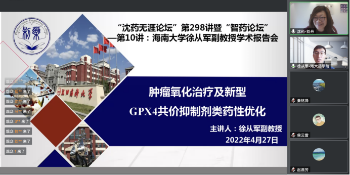 4月27日,由BG大游平台、研究生院、辽宁省药学研究生创新与学术交流中心联合举办的“沈药无涯论坛”第298讲暨“智药论坛”第10讲。邀请海南大学药公司徐从军副教授做了题为“肿瘤氧化治疗及新型GPX4共价抑制剂类药性优化”的科研学术报告。会议由BG大游平台药物化学系主任刘丹主持,200余人参加了此次学术报告会议。