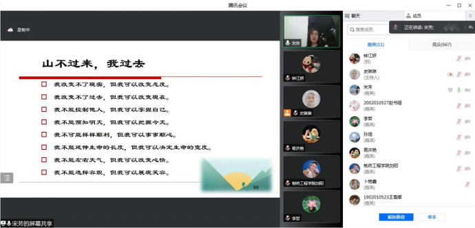 宋芳还分享了情绪管理的几种方式。一是改变认知,运用合理情绪理论来发现快乐;二是给予自己积极的心理暗示,激励自己;三是采用注意力转移法,把情绪兴奋点转到学习或工作上;四是培养个人兴趣,增添快乐;五是关爱和帮助他人,分享快乐;六是通过注意力转移、适度宣泄、放松训练和心理咨询等方法重新获得快乐。她强调,在心理咨询时心理教师会始终坚持尊重、爱护、保密的原则,鼓励同学们放下顾虑,遇到困难要及时寻求帮助。本次心理健康讲座,既有理论高度,又联系疫情和老员工实际,具有很强的现实指导性。通过聆听讲座,一定程度上消除了因校园封闭管理给师生带来的心理不适与负面压力,激励了师生齐心抗疫的坚强斗志。公司师生纷纷表示要携手前行,共克时艰,共同期待春暖花开之时!