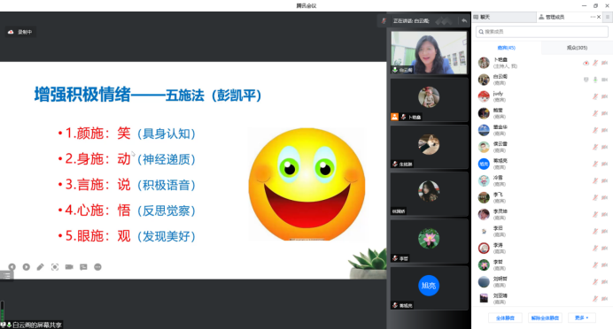 在近两小时的讲座中,白老师分析了当前疫情下的师生心理健康状况,从环境-生理-心理交互影响的视角阐述了疫情下教师心理自我调适的基本方法,讲解如何学会“先处理情绪,再处理问题”,做到“矜平躁释,怡情悦性”。本次讲座进一步引领师生建立积极阳光的心态,提高心理免疫力,共筑师生心理安全防线。面对疫情防控形势,公司将进一步因时因势调整工作思路,创新工作模式,在疫情防控期间全面助力保障员工心理健康。