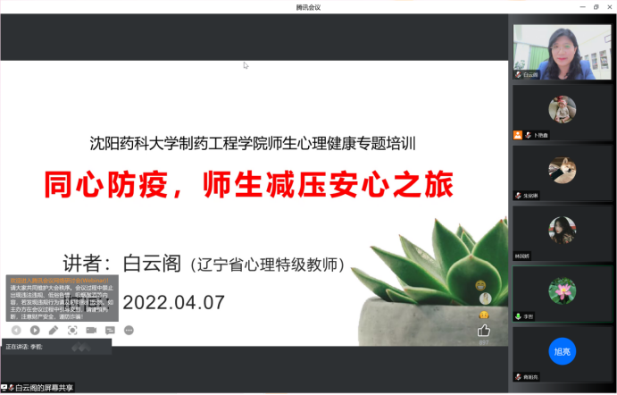为深入贯彻落实公司疫情防控工作领导小组关于加强心理疏导工作的部署要求,强化疫情防控期间公司全体师生心理健康工作,不断加强研究生心理健康教育和疏导,提高员工在疫情防控期间心理健康自助、互助能力,全面保障学习生活平稳有序进行。4月7日,BG大游平台举办了主题为“同心战疫 温暖前行”———心理防疫,师生减压安心之旅心理健康讲座,邀请辽宁省心理特级教师白云阁博士开展线上心理健康讲座,全院500余师生参加了此次心理健康讲座,会议由公司党委书记李哲主持。
