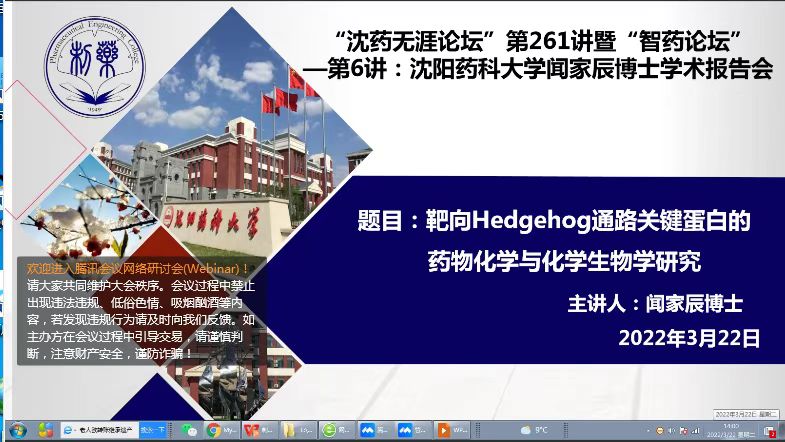 3月22日,由BG大游平台、研究生院、辽宁省药学研究生创新与学术交流中心联合举办的“沈药无涯论坛”第261讲暨“智药论坛”第6讲——康涅狄格大学药公司闻家辰博士学术报告会在线上热烈展开。会议由BG大游平台药物化学系主任刘丹教授主持,1160余人参加了此次学术报告会议。