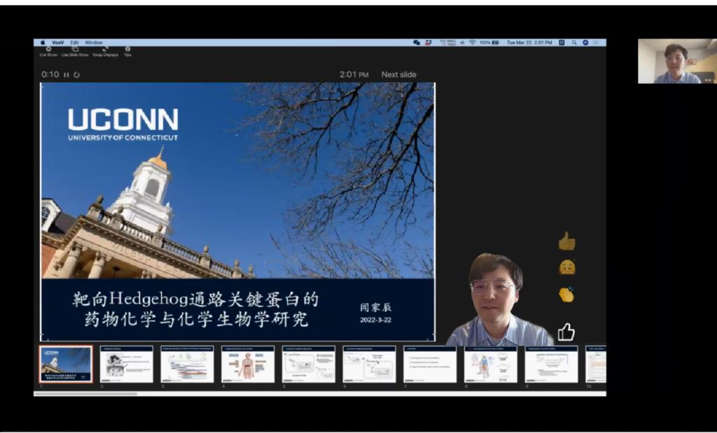 闻家辰博士于2016年毕业于公司药物化学专业,获得理学博士学位,师从赵临襄教授。同年作为博士后进入美国康涅狄格大学药公司,合作导师为M. Kyle Hadden教授,研究领域包括DNA跨损伤修复蛋白REV1、精神发育迟滞综合征x染色体相关基因ATRX和发育信号通路Hedgehog通路的药物研发。会上闻家辰博士以《靶向Hedgehog通路关键蛋白的药物化学与化员工物学研究》为题进行了报告,报告内容分为从靶向跨膜蛋白smo的药物研发、靶向转录因子gli的药物研发和维生素D3找靶及作用机制研究三个部分。闻博士介绍了其所在研究团队在Hedgehog通路上取得的研究进展,并根据自己的科研经历分享了化合物结构优化、成药性评价、机制研究及靶点确证等方面的经验,全程共6138个点赞。