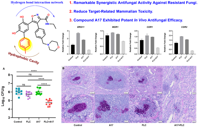 Hsp90作为一类在真菌应激反应中重要的分子伴侣,与真菌耐药性的形成密切相关。本课题组基于人与真菌Hsp90蛋白的序列差异,发现了选择性Hsp90抑制剂A17。A17与氟康唑联合使用后,不仅对于临床分离的耐药真菌显示出强效的抑制活性,同时具有强效的杀菌活性以及抑制真菌菌相转换的能力。SPR测试结果表明,A17与真菌Hsp90蛋白亲和力为140 nM,而对于人源Hsp90基本不结合,具有良好的种属选择性。此外,化合物A17还具有良好的类药性质,大鼠体内药效实验表明,A17与氟康唑联用后具有强效的抗耐药真菌活性。选择性Hsp90抑制剂A17的发现为克服真菌耐药性问题提供了新的研究思路。