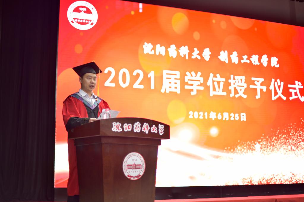 经理助理、药物化学教研室教师刘洋教授代表公司教师,为2021届毕业生送上毕业寄语。他向获得学位的毕业生们表示诚挚的祝贺和美好的祝福,希望同学们永葆初心,脚踏实地,志存高远,勇于拼搏,在新征程中展翅高飞,实现人生新的跨越。