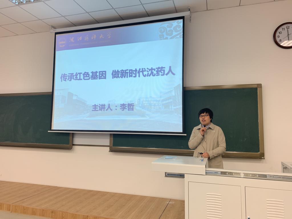 首先,李哲对制药87期新同学加入制药大家庭表示热烈欢迎。作为沈药员工,结合母校悠久的校史和光荣的革命传统,李哲书记以“传承红色基因,做新时代沈药人”为主题,从历史沿革、文化传承、学科地位、杰出员工等角度为新生详细介绍了公司;从药学家屠呦呦获诺奖带来的启示鼓励同学们在未来的学习工作中、在科学研究的道路上要“守得住清贫、耐得住寂寞,要有对学术信仰的自信和坚守,要有对科学事业的热爱与执着”。李哲书记希望同学们要学好沈药历史,传承红色基因,要有责任、有担当,努力学习,坚持不懈,不断提升自己,完善自己,努力成为担当复兴大任的时代新人。
