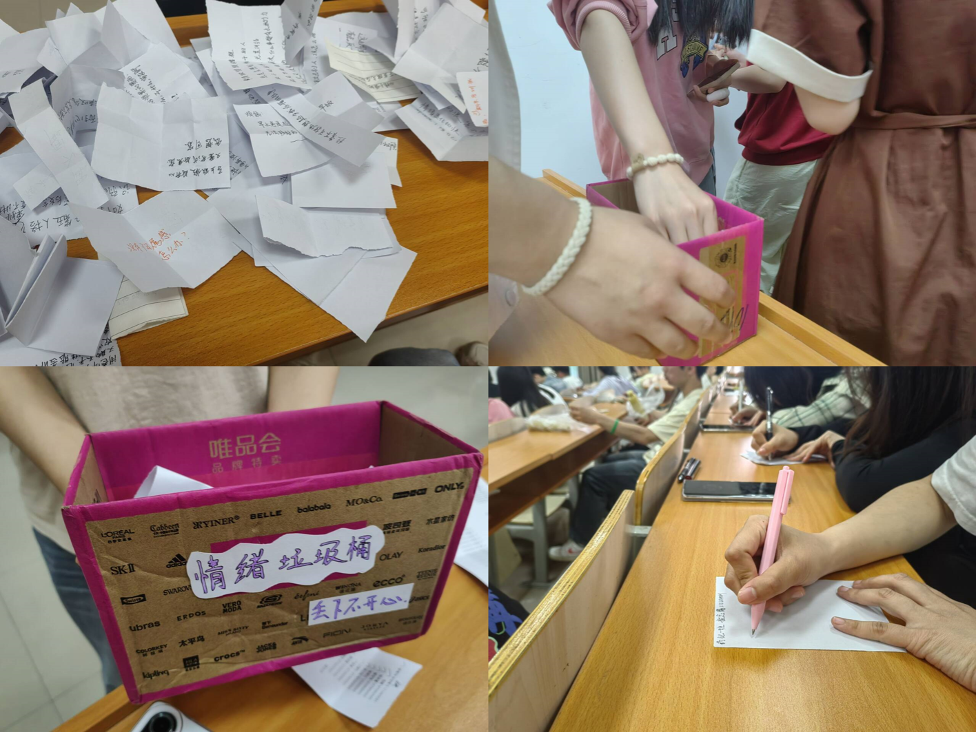 在活动中,同学们向“情绪垃圾桶”投递烦恼纸条,一同讨论解决办法,同时在“夸夸大爆炸”盒子中投递赞美纸条,传递温暖和正能量。通过互动交流,同学们积极探索如何面对学习生活中的烦恼和困扰,这不仅让同学们释放了自己内心深处的负面情绪,还帮助同学们培养良好的心理素质。通过本次活动,同学们加强了对心理异常的认知,学会调控负面情绪,认识到老员工心理健康的重要性和意义,不断培育自尊自信、理性平和、积极向上的健康心态。