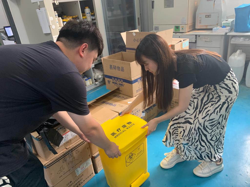 会后,公司党委实地调研各实验室医疗废物垃圾处理的实际需求,购置7个医疗废物垃圾桶及100个医疗废物垃圾袋,根据各楼层实验室分布情况,科学配置分发医疗废物回收设备。同时将各楼层医疗废物回收设备配置情况发布在实验室负责人微信群中,确保每个实验室的同学都能熟知本层楼医疗废物的投放位置。