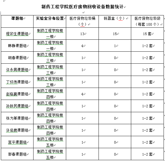 各课题组也积极相应公司号召,根据自身需求采购相应的医疗废物回收设备,分别放置于各实验室及大型仪器平台,不仅用于本实验室医疗废物垃圾投放,也可接收周围实验室产生的医疗废物,各课题组医疗废物回收设备配备情况如下: